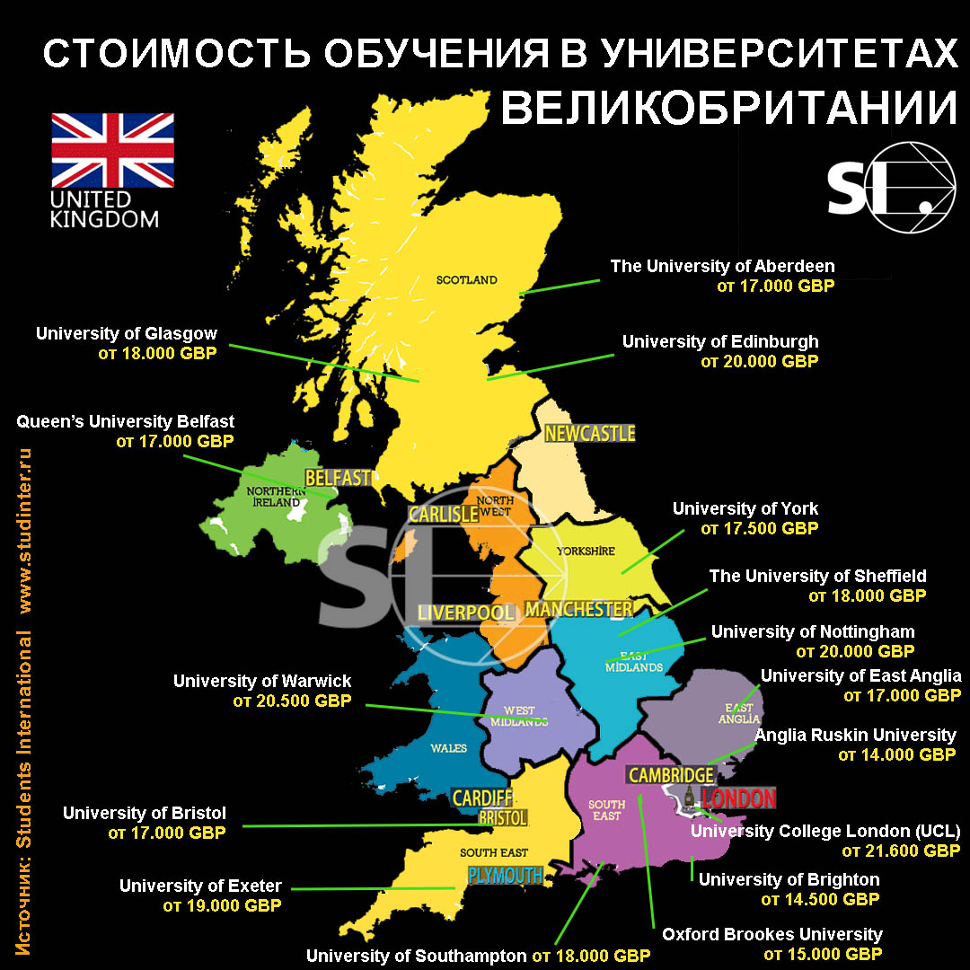 Для ответа на первый вопрос мы приготовили для Вас несколько картинок. На них видна не только стоимость обучения, но и география тех вузов, см которыми работает наше образовательное агентство. Сразу заметим, что таких вузов значительно больше, но формат небольшой картинки не дает нам возможность указать все, скажем, 50 вузов, с которыми мы сотрудничаем в Великобритании!